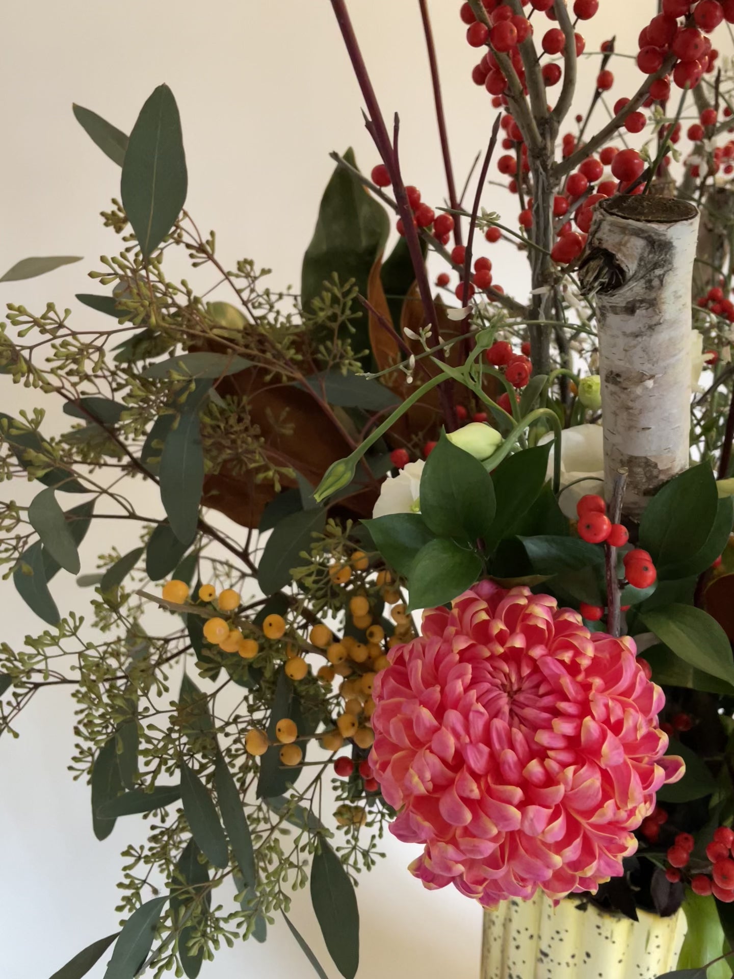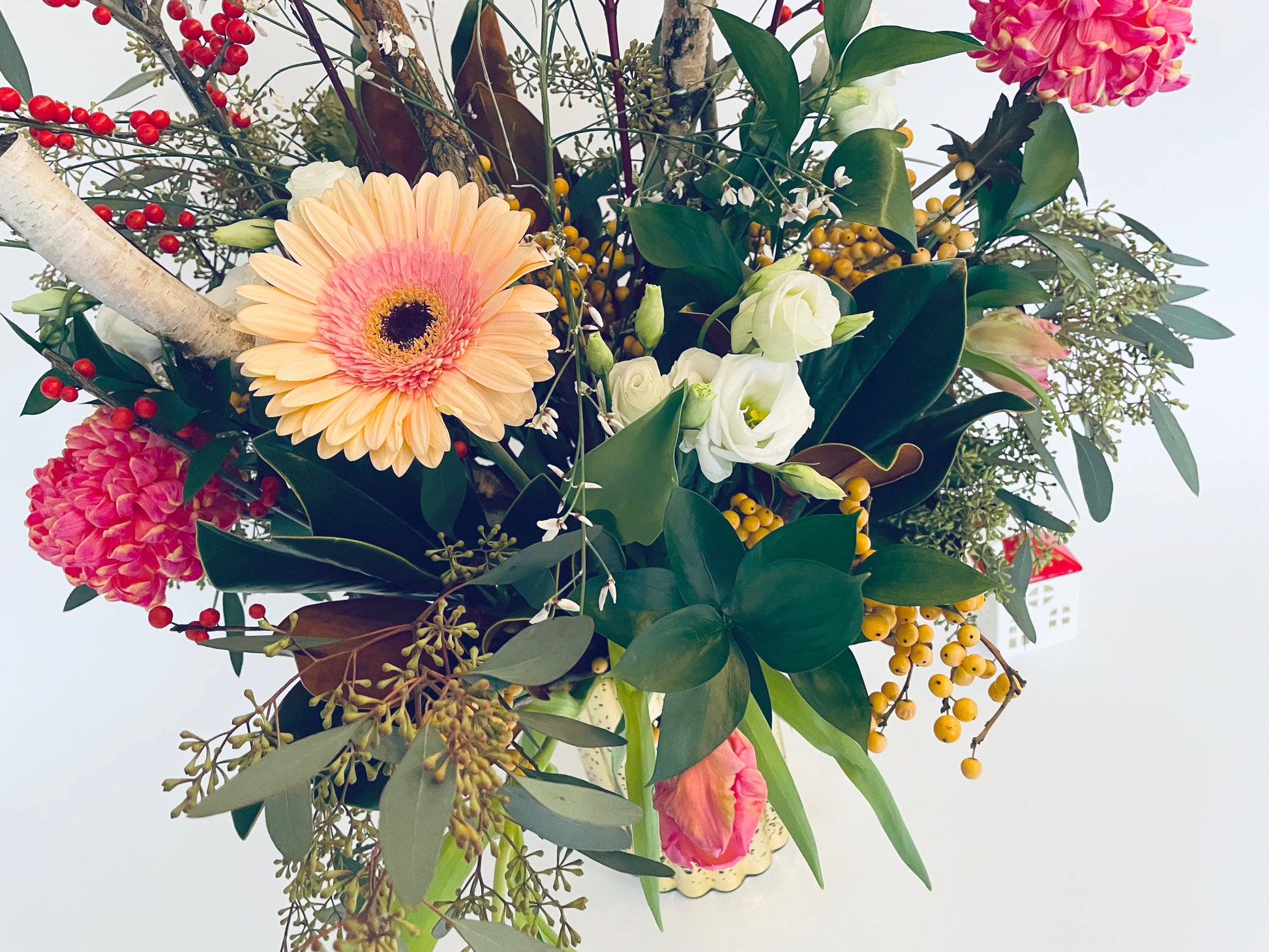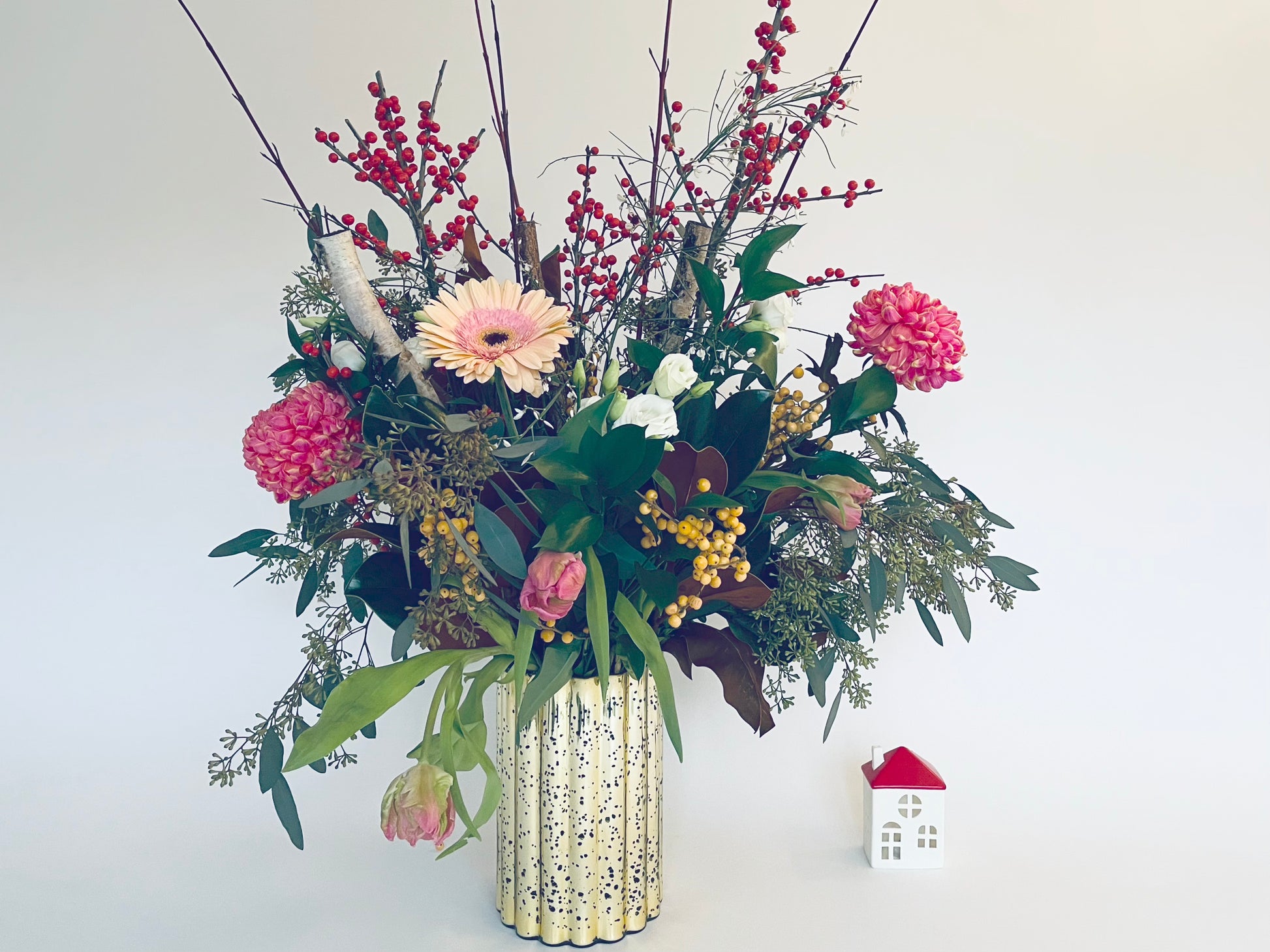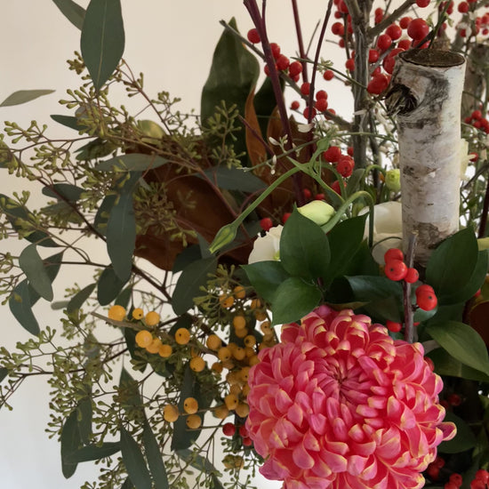 Immerse yourself in the enchantment of our signature holiday creation. Picture a beautiful blend of cool crimson and ivory petals alongside lush greenery, creating a winter scene. Gilded highlights and rustic birch poles add that seasonal charm, making it a truly enchanting display. Discover the essence of winter in every bloom. ❄️🌹🌿 #FrostKissedArrangement #Arrangements #FloralArrangement #Holidays
